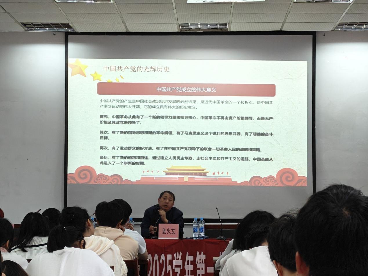 典礼结束后,姜火文以“党史”为主题为118名学员们带来了第一堂党课。课程从“为什么学习党史”以及“怎么学习党史”两个方面讲述了学习党史的意义,随后,姜火文带领同学们深入了解中国共产党成立的历史背景,并概述了其发展历程中的三个重要历史时期。此次党课不仅丰富了同学们的理论知识,更在他们心中种下了红色的种子,激励着他们为中华民族伟大复兴而勤奋学习、不懈奋斗。