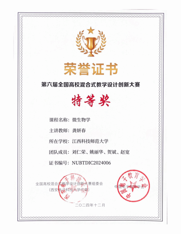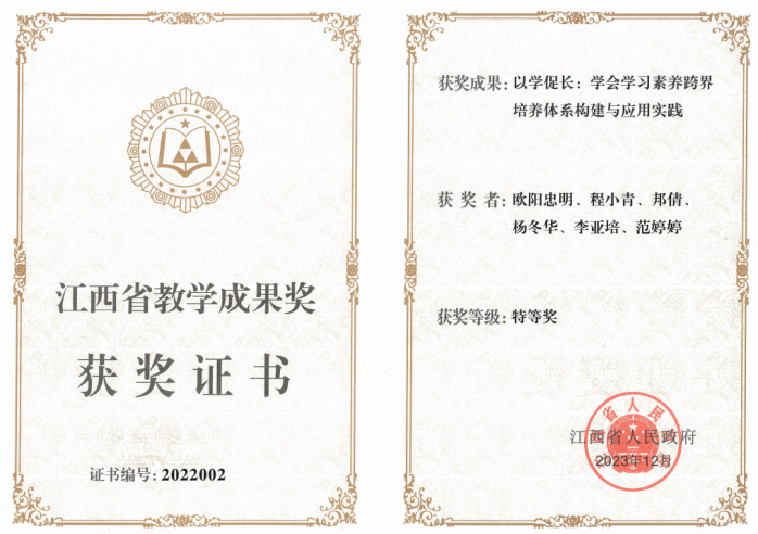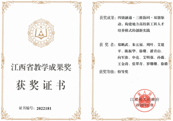 近5年获批线上和线上线下混合式一流课程国家级6门,教育部重点领域教学资源建设项目1项,省级混合式教学改革项目19项。近3届获省级教学成果奖32项,2023年获江西省教学成果特等奖3项,位列全省第一。教师在全国高校教师教学创新大赛获一、二、三等奖各1项,全国混合式教学设计创新大赛获特等奖2项、一等奖1项。