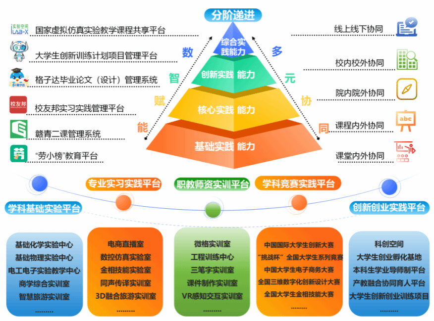 构建“四阶层、五协同、六赋能”实践育人体系。将学生创新实践能力贯穿威廉希尔全过程,实现学生实践能力递进式培养。学校人文社科类专业实践教学学分占总学分(学时)比例≥15%,理工农医类专业实践教学学分占总学分(学时)比例≥25%。