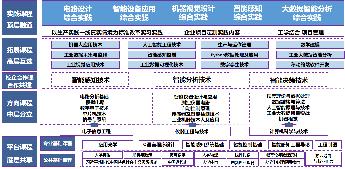 主修课程包括:数据结构与算法、传感器及智能检测技术、人工智能原理与技术、误差理论与数据处理、智能仪器设计与应用、自动控制原理、应用光学、测控仪器电路、智能控制、移动终端软件开发、机器视觉、大数据工业项目实战、工业机器人及应用等。