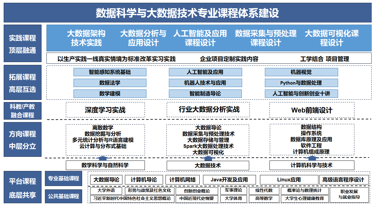 主修课程包括:高等数学、线性代数、概率论与数理统计、离散数学、大数据导论、人工智能及应用、数据结构、Python与数据处理、数据库原理与应用、多元统计分析与R语言建模、数据挖掘、大数据可视化、Spark大数据处理技术等。