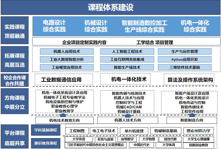 主修课程:高等数学,机械工程、控制科学与工程,机电传动与控制、PLC技术及应用、智能传感与检测技术、数字电路与逻辑设计、模拟电子技术、单片机原理与应用、机器人技术与应用、机械CAD/CAM、机械工程控制基础、机械设计基础、机械制造技术基础、职业教育心理学、职业教育学、机械电子工程专业教学法等。